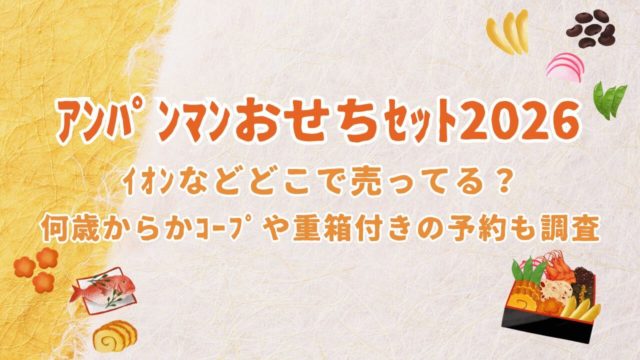 グルメ アンパンマンおせち2026予約いつ?イオンなどどこで売ってる?何歳からかコープや重箱付きの予約も調査 2025年11月13日 こふじまる KoFu Times 2026年のお正月に向けて、子どもも大喜びの「アンパンマンおせちセット」が今年も話題です! どこで買えるの?何歳から食べられるの?コ …